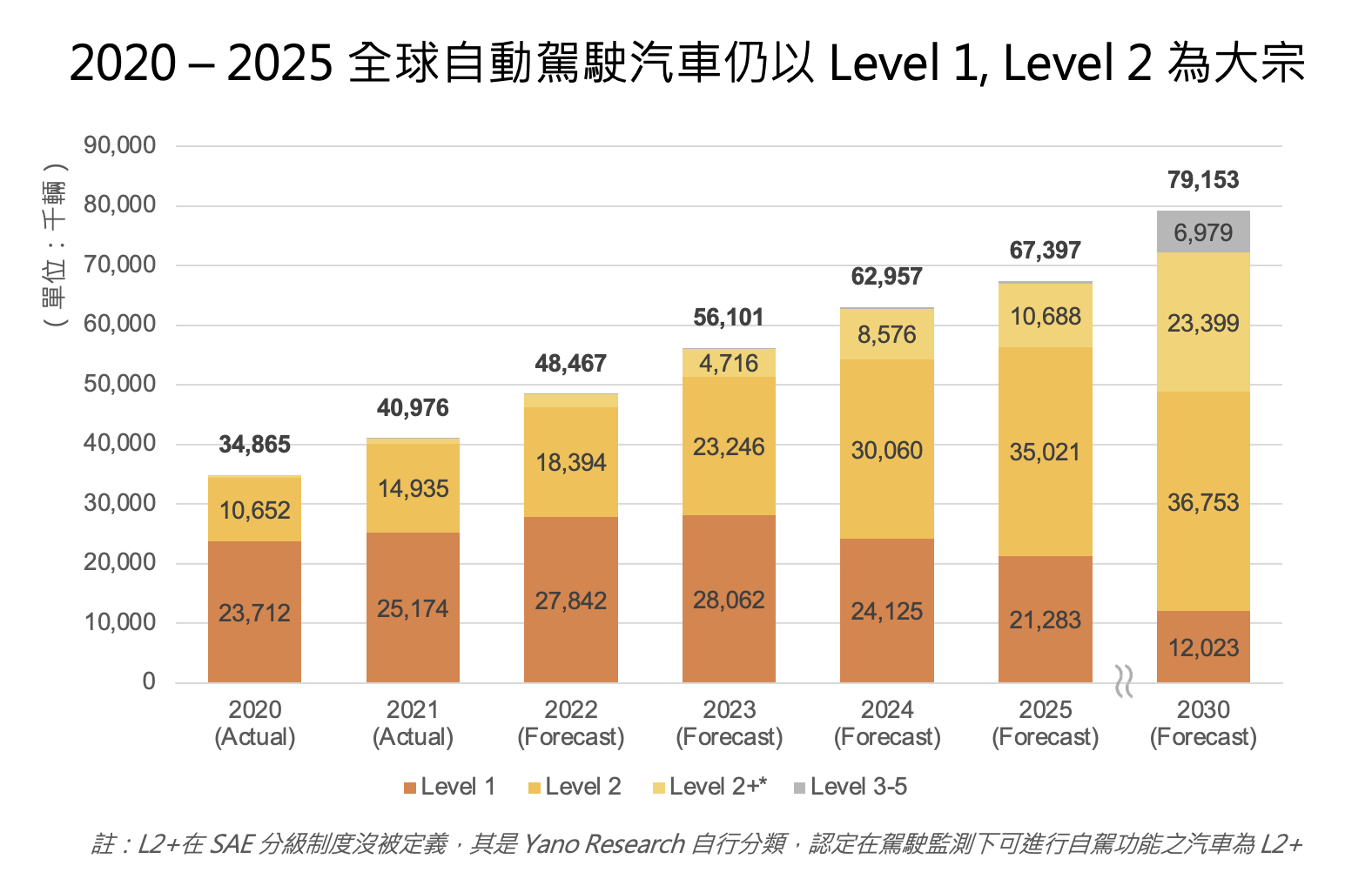 而 Level 3 以上因對安全性的要求非常高,除了車廠自身需要進行反覆的測試也要通過監理機關的認證,預估要到 2025 年後才會開始顯著成長。