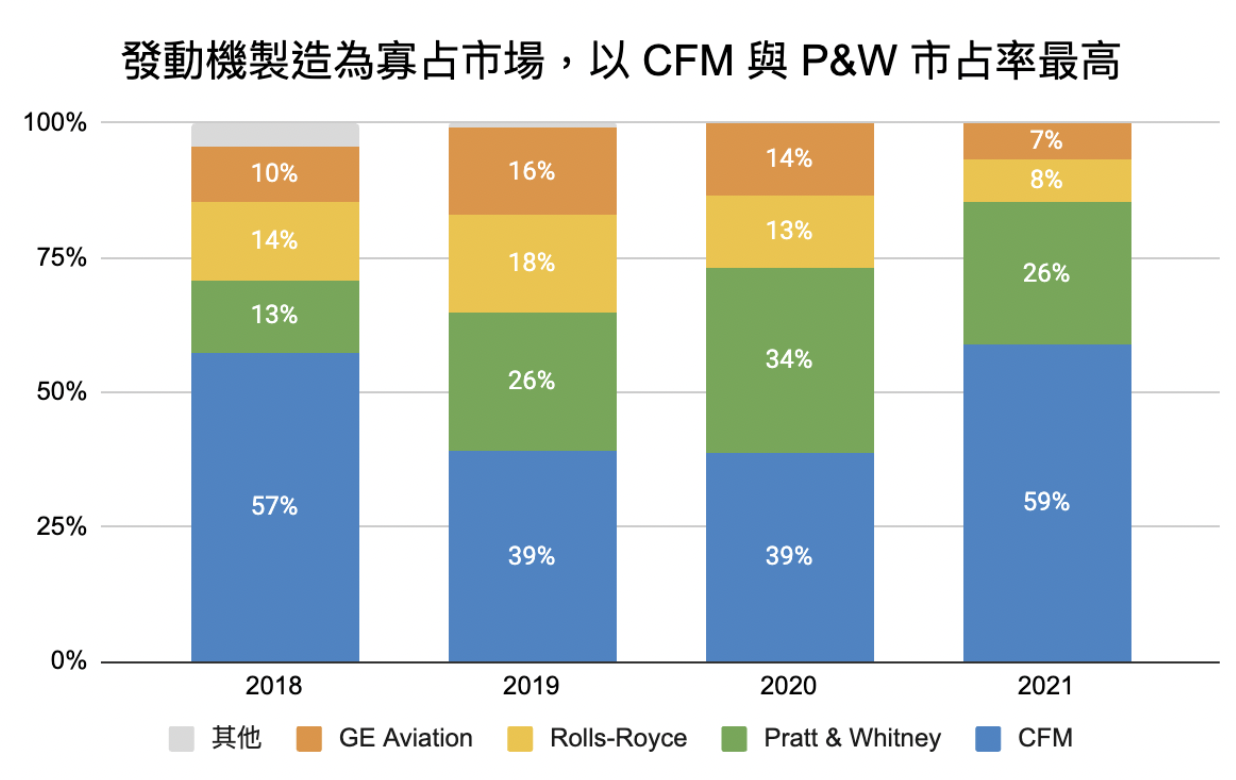 註2:2019~2020 年 CFM 市占率明顯衰退主因 Boeing 737 MAX 停飛,現已恢復正常