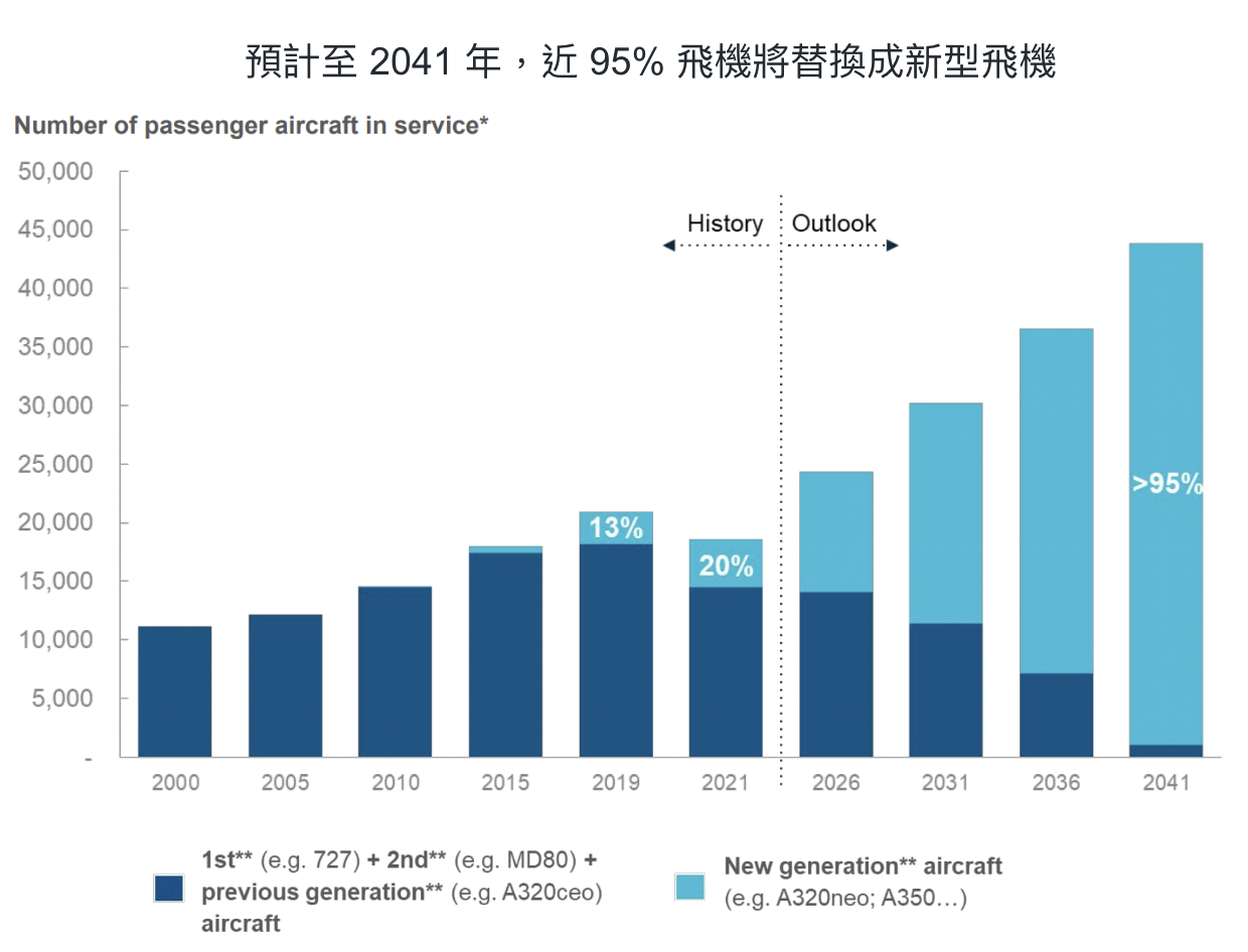 航空公司積極投資機隊現代化改革,預期將於 2041 年近全數替換為新型飛機