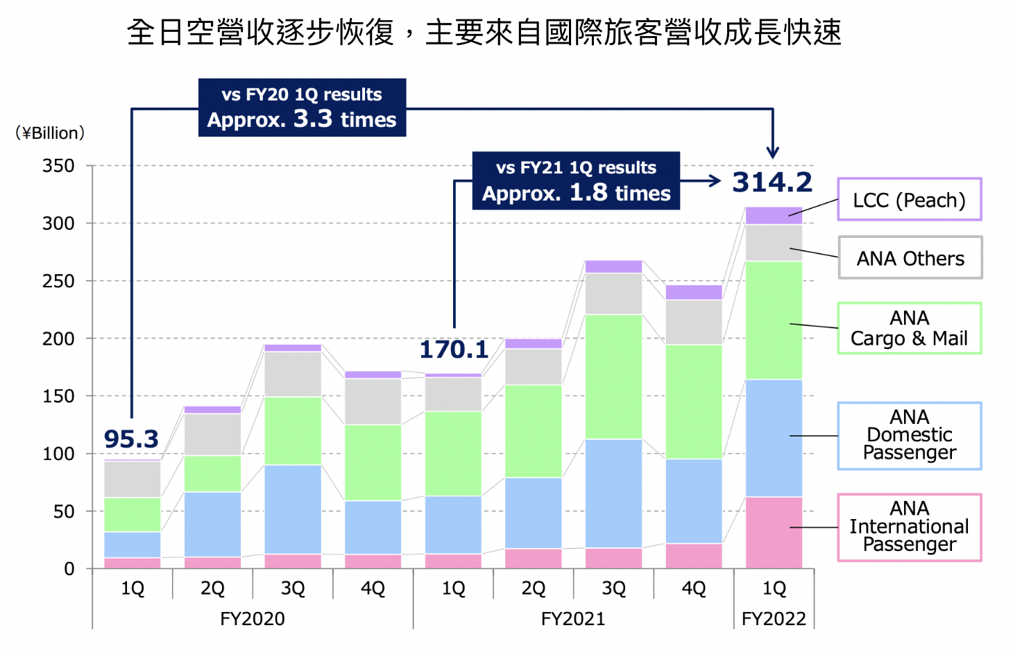以近期開放入境的日本為例,全日空航空(ANA)於今年八月公布 FY2022Q1 財報,營收年增 76%,主要成長來自國際旅客。公司預計在 FY2022Q2 之後,隨日本邊境開放,國際乘客數量將達到疫情前(2019 年)30%,中國、香港和台灣旅客將使整體市場供不應求,帶動機票票價上漲。全日空對 FY2022 全年財務展望營收 1.7 兆日圓,年增 63%,顯示目前日本航空需求強勁復甦,對今年營收樂觀。