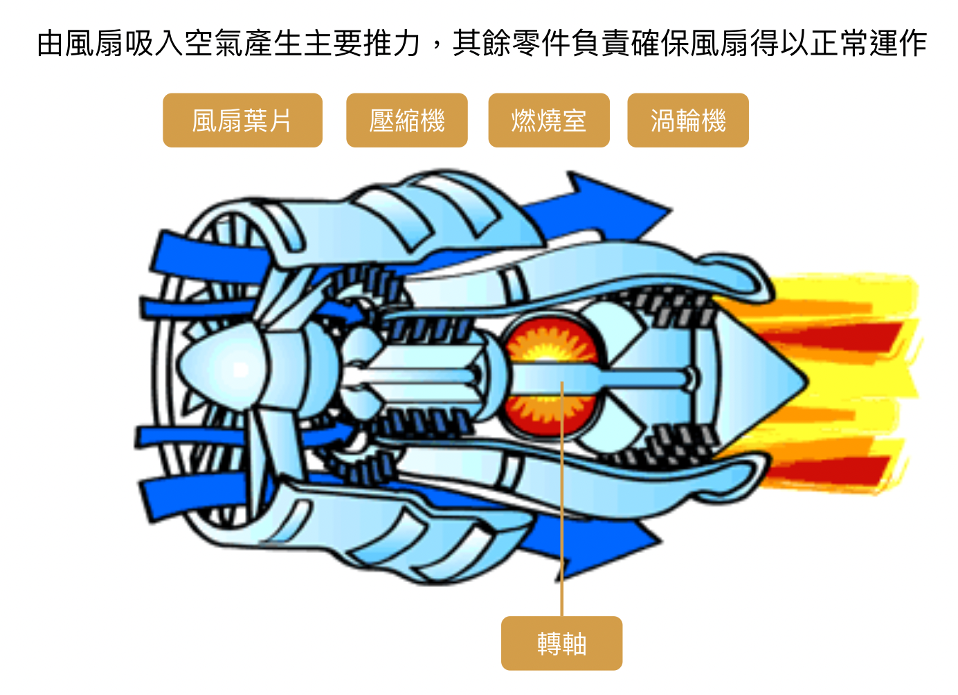 發動機由風扇葉片、低壓壓縮機、高壓壓縮機、燃燒室、高壓渦輪機、低壓渦輪機,是決定飛機油耗效率的關鍵。其運作原理可簡單理解為吸氣、壓縮、燃燒、噴氣四步驟,由風扇運轉吸入空氣,經過外涵道(發動機的外側)產生發動機主要的推力,另一部分空氣進入內涵道(發動機的核心)並進行燃燒,高溫高壓燃燒氣體能量用來轉動渦輪葉片,以帶動轉軸連接的風扇葉片與壓縮段持續吸入空氣。
