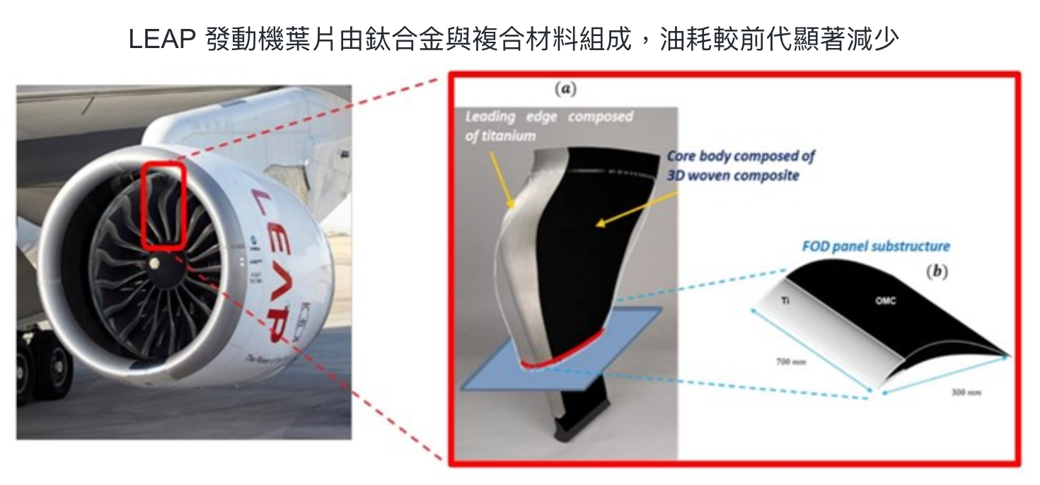 而發動機最大的改革在於風扇葉片與渦輪機葉片的材料更換,由過往金屬材料(鈦合金與鎳基合金)轉換至更輕的複合材料(碳纖維材料與陶瓷基複合材料)。例如引擎製造大廠 CFM LEAP, 因使用碳纖維複合材料,較其上一代發動機 CFM56 降低約 49% 葉片重量,油耗也降低 15%。