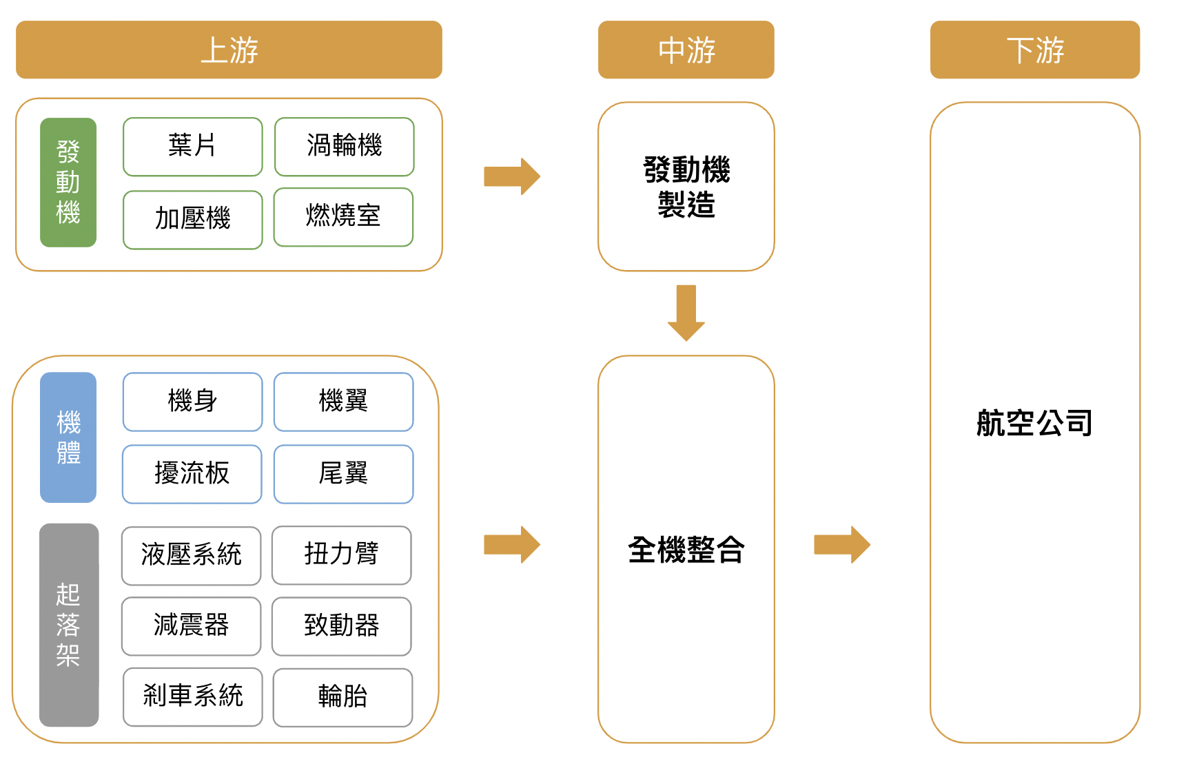 航太產業鏈分別為上游零組件、中游飛機發動機製造與全機整合商及下游航空公司。
