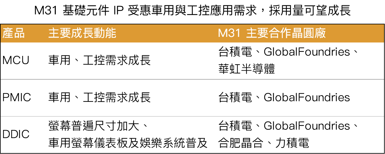 M31 基礎元件 IP 受惠車用與工控應用需求,採用量可望成長
