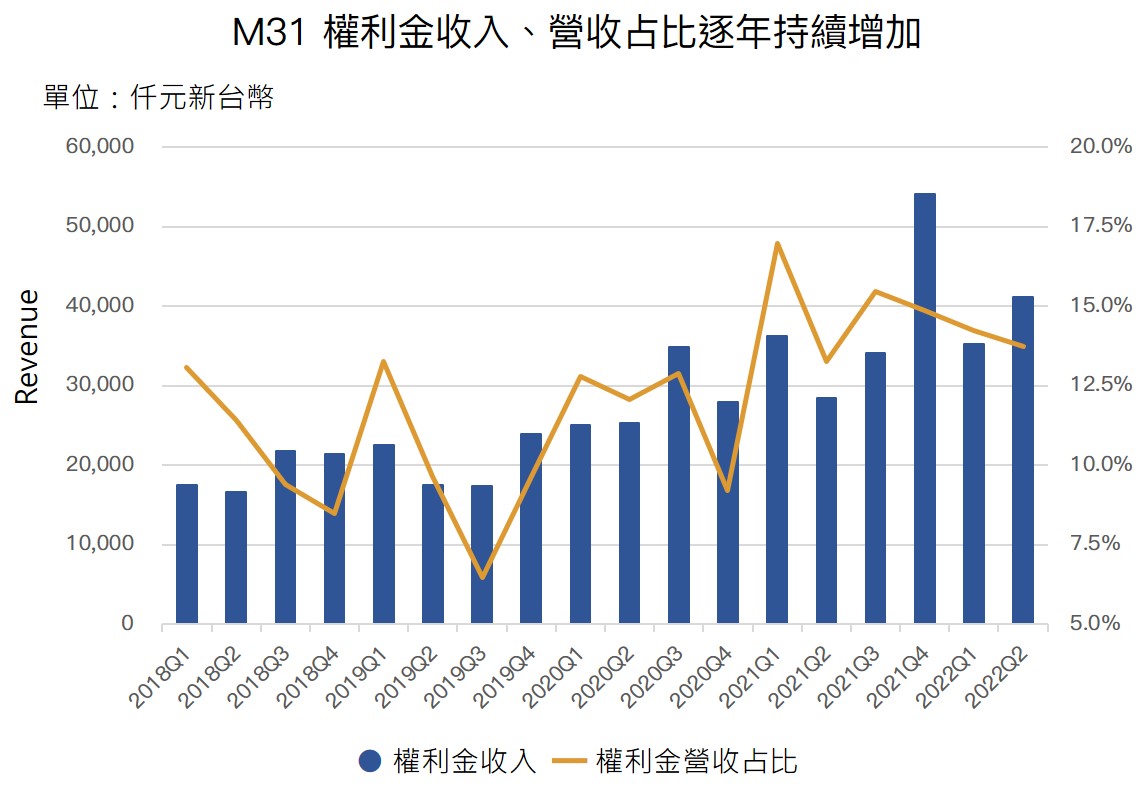 雖短期價格有壓力,但長期而言,整體營收狀況仍會受惠車用半導體元件需求大幅增加而成長,預期 M31 權利金收入和整體營收占比逐年持續提升(2021 全年已達 15.1%)。