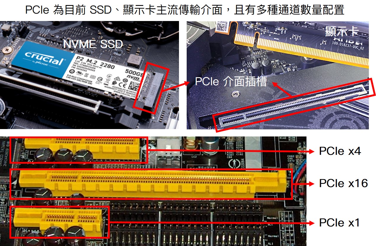 PCIe 介面主要用於固態硬碟(SSD)和顯示卡等硬體的資料傳輸,自 2003 由 Intel、IBM 等多間公司推出 1.0 後,一路發展至目前主流的 4.0,並往 5.0、6.0 邁進。從 3.0 開始,每一代新規格的理論傳輸速率都為前一代的 2 倍(5.0 單通道速率已達 32GT/s)。