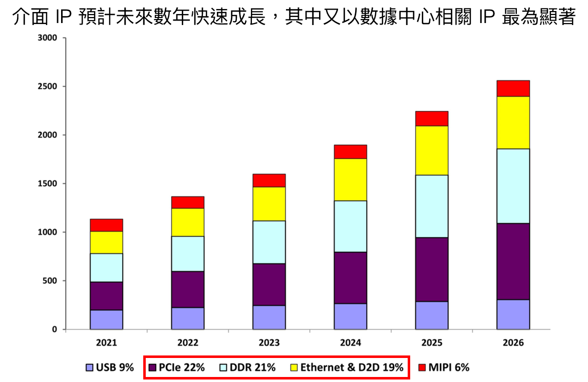 根據調研機構 IPnest 的資料顯示,前五大主流傳輸介面 IP(包含 USB、PCIe、DDR、Ethernet 和 MIPI) 2021-2026 年預計將以 CAGR+18.6% 速度成長,其中又以牽涉雲端產業、高速網路傳輸相關的介面,例如 PCIe、Ethernet 和 DDR,在網路傳輸速度和頻寬要求提升下成長最快。