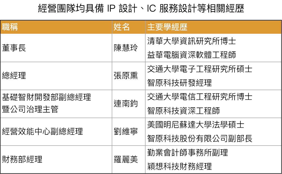 包含陳董事長在內,經營團隊均具有相關 IP 設計(包含益華電腦(Cadence)、穎想科技)和 IC 設計服務(智原科技)經歷,產業背景豐富,且在 IP 產業耕耘多年,也使 M31 在客戶獲取上具備一定優勢。