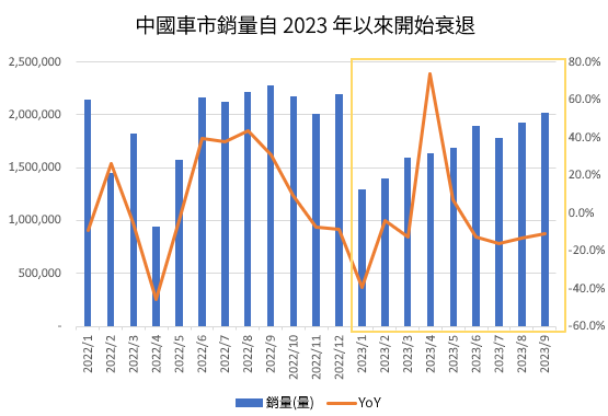 自 2023 年初以來,佔據全球汽車出貨量約 35%、電動車市場 60% 份額的最大市場中國,在整體經濟轉差的背景下,車市表現並不樂觀,2023 前三季的汽車出貨量均較去年明顯下滑。