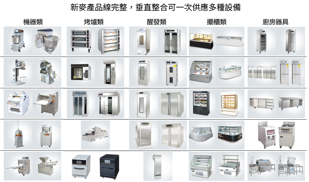 新麥產品可分為「商用烘焙設備」及「其他廚房設備」兩大類,前者包括烤爐、發酵機、攪拌機、展示櫃、壓麵機、分割滾圓整型機等,占營收 85%,後者則包括冰箱、洗滌設備、油炸爐、工作台冷櫃及各種器具,占營收 15%。公司產品線完整,可一次供應多種設備。
