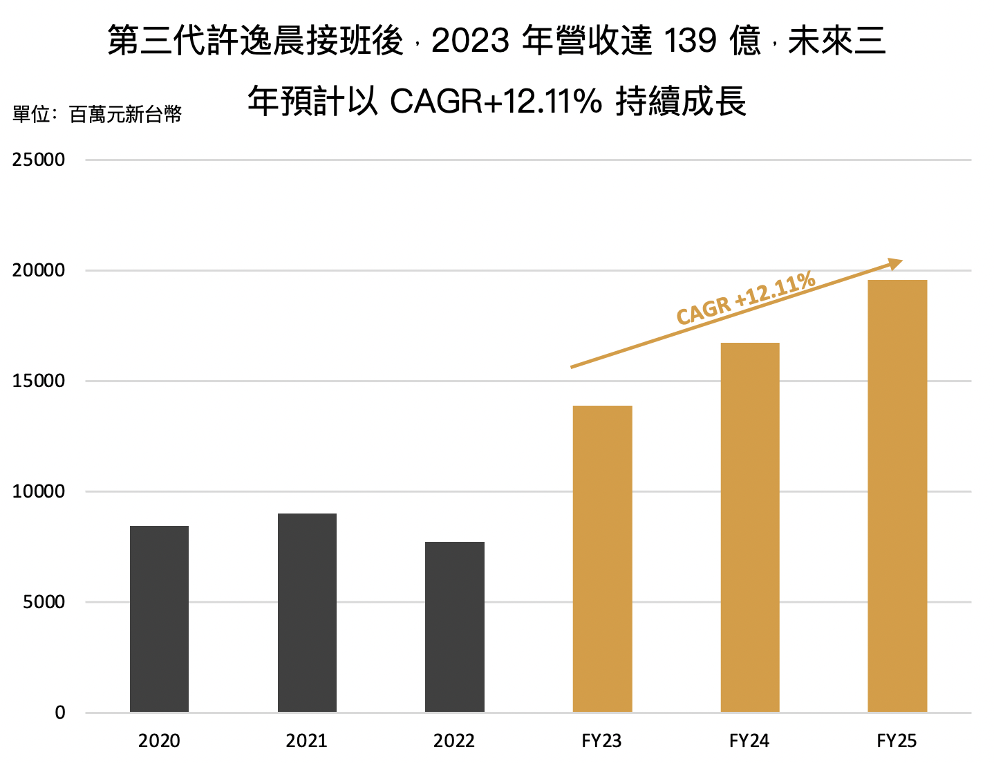 華城電機前十大股東均為許家親戚,合計持股比達 33%,為家族企業。家族企業成長的關鍵在於接班人是否有能力,而目前第三代許逸晨於 2017 年擔任執行長後,帶領公司進行數位轉型及切入綠能領域,使得營收從 2017 年約 50 億元新台幣(以下同)到 2023 年達 139 億元(CAGR+15.45%)。