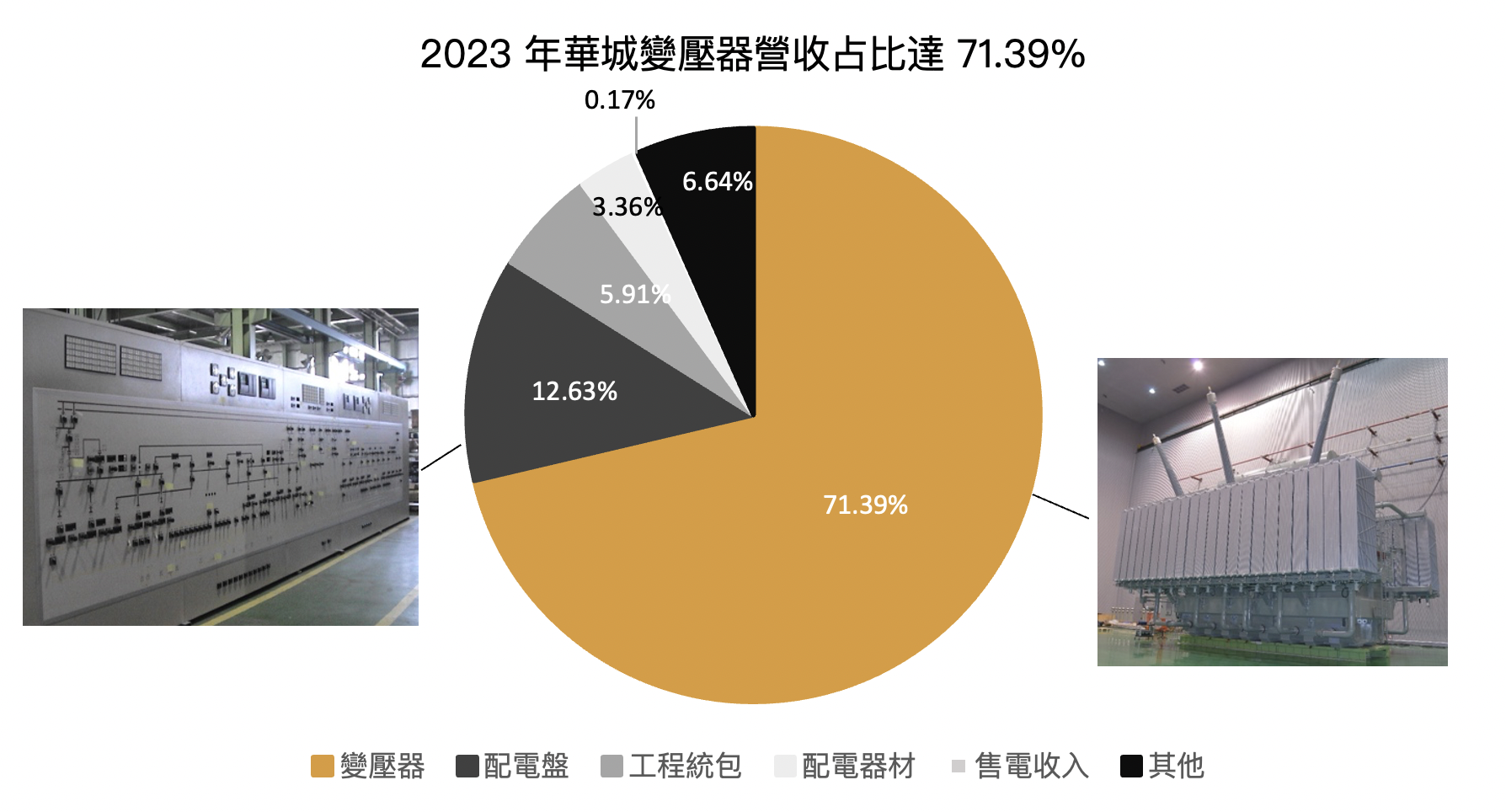 華城電機(市:1519)成立於 1969 年,主要業務為重電設備,營收以變壓器為主(71.39%),其餘還有配電盤(12.63%)及工程統包(5.91%)。