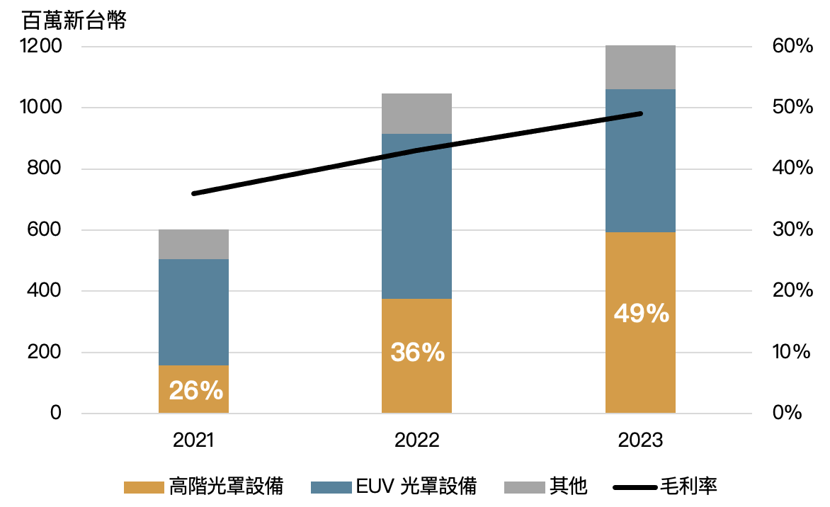 註:DUV 及高階光罩設備的毛利率約為 40-50%,而 EUV 產品線毛利率較低(約 30-40%)主要受前期拓展市占的讓利效果,預計後續將持續轉佳。