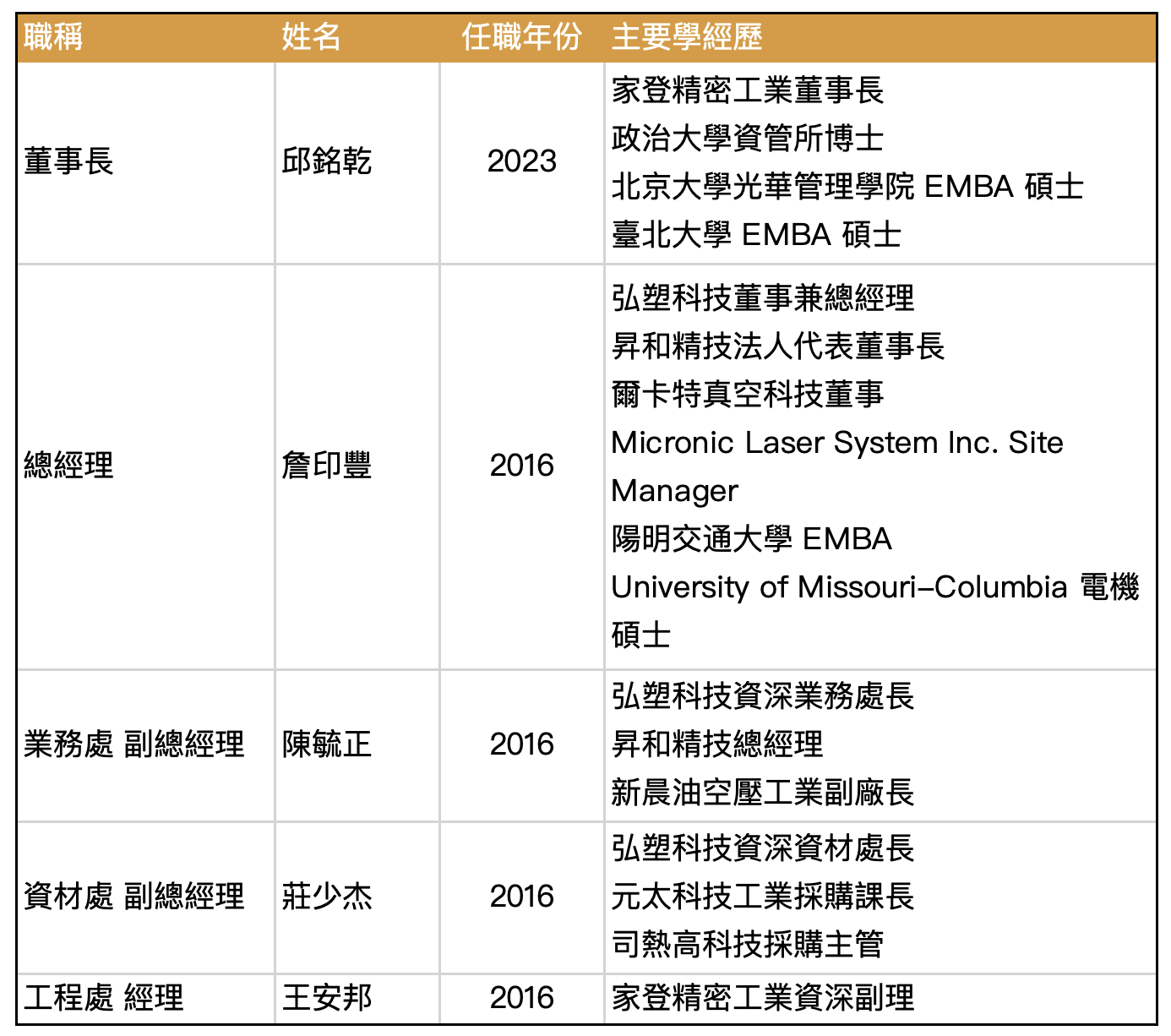 目前家登及家碩董事長仍由創辦人邱銘乾先生領導,並由外部引進專業經理人,包括總經理、業務處副總、資材處副總等人皆來自弘塑科技(櫃:3131),弘塑科技為國內半導體濕製程設備的領導大廠,整體經營層具豐富的產業經驗。