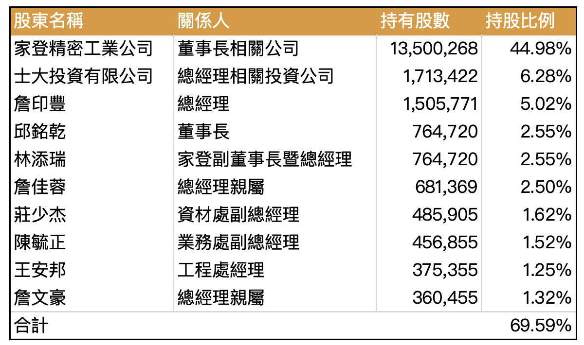 股權方面,第一大股東為家登持股 45%,其餘均由公司經營層及其親屬所掌握,前十大股東合計持股比例達 70%,整體股權高度集中穩定。