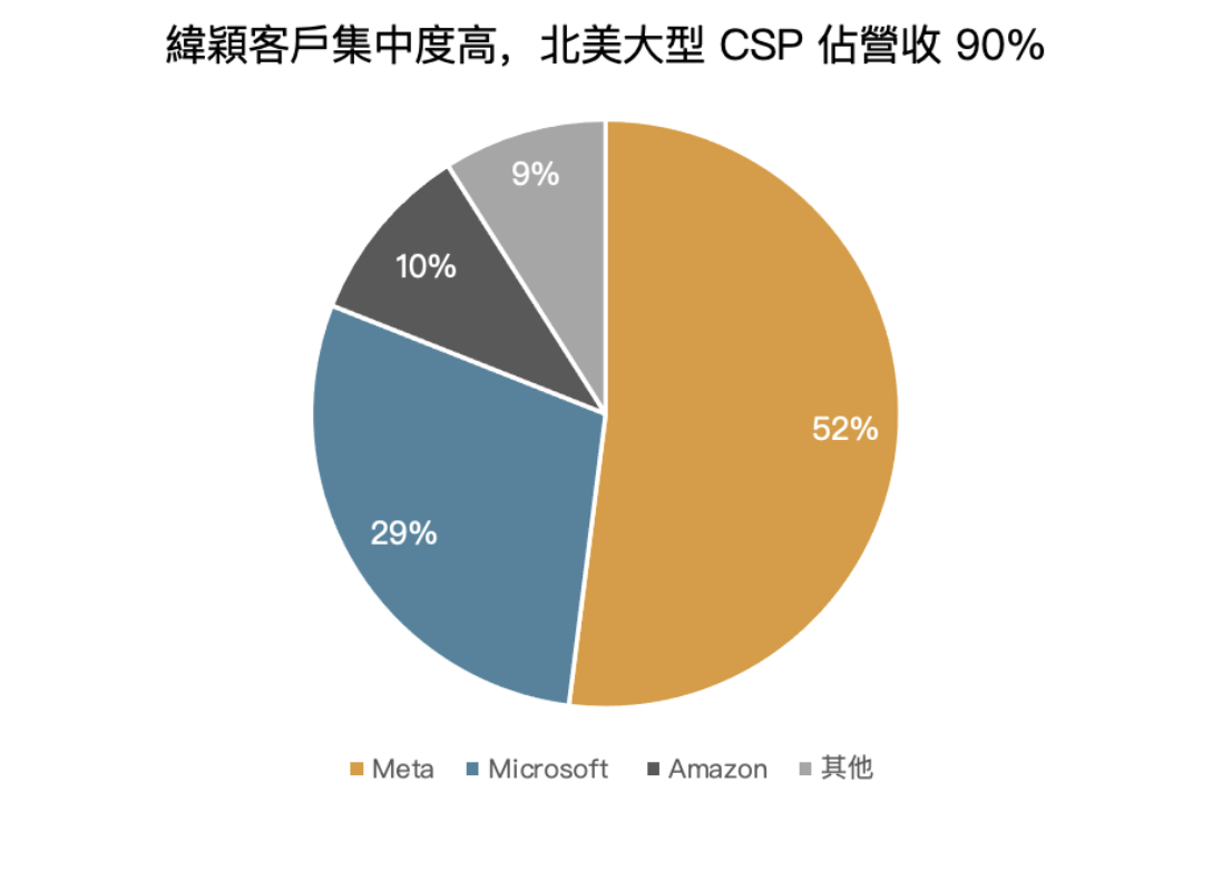 緯穎(市:6669)於 2012 年自 緯創(市:3231)拆分,拆分後,由緯創負責承接品牌廠商的代工訂單(傳統伺服器代工模式),而緯穎則經營雲端服務供應商(Cloud Service Provider, CSP)的訂單(ODM direct),提供超大型資料中心(Hyperscale Data Center)客製化的伺服器系統整合解決方案。緯穎主要客戶以美國三大大型 CSP 廠商為主,其中 Meta 就佔營收近 50%,Microsoft 則佔 30%,Amazon 10%,因此看這三間公司的策略營運,就可大機率判斷緯穎的成長動能。