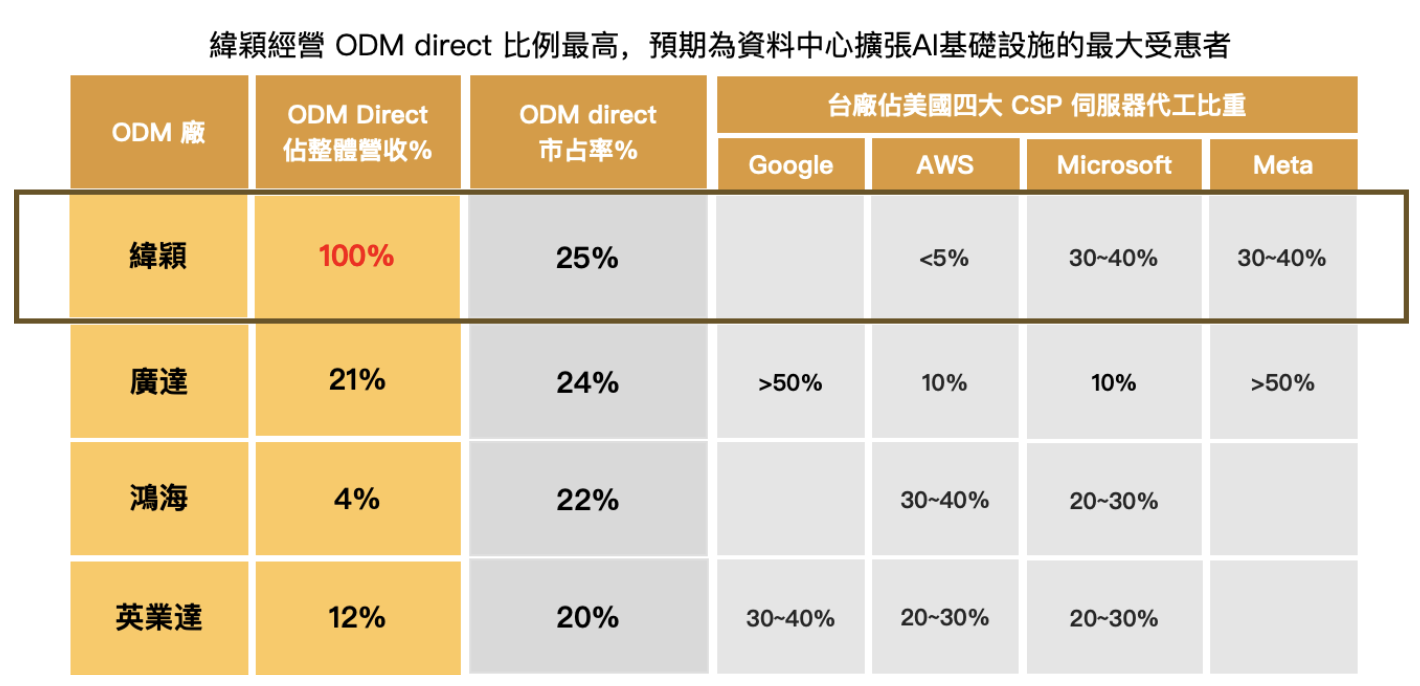 與市場上其他供應商(如廣達、鴻海、英業達等)不同的是,緯穎 ODM direct 模式純度最高,預期在 CSP 持續擴張雲端服務及 AI 基礎設施之下,將能夠最大程度的受惠於此趨勢。