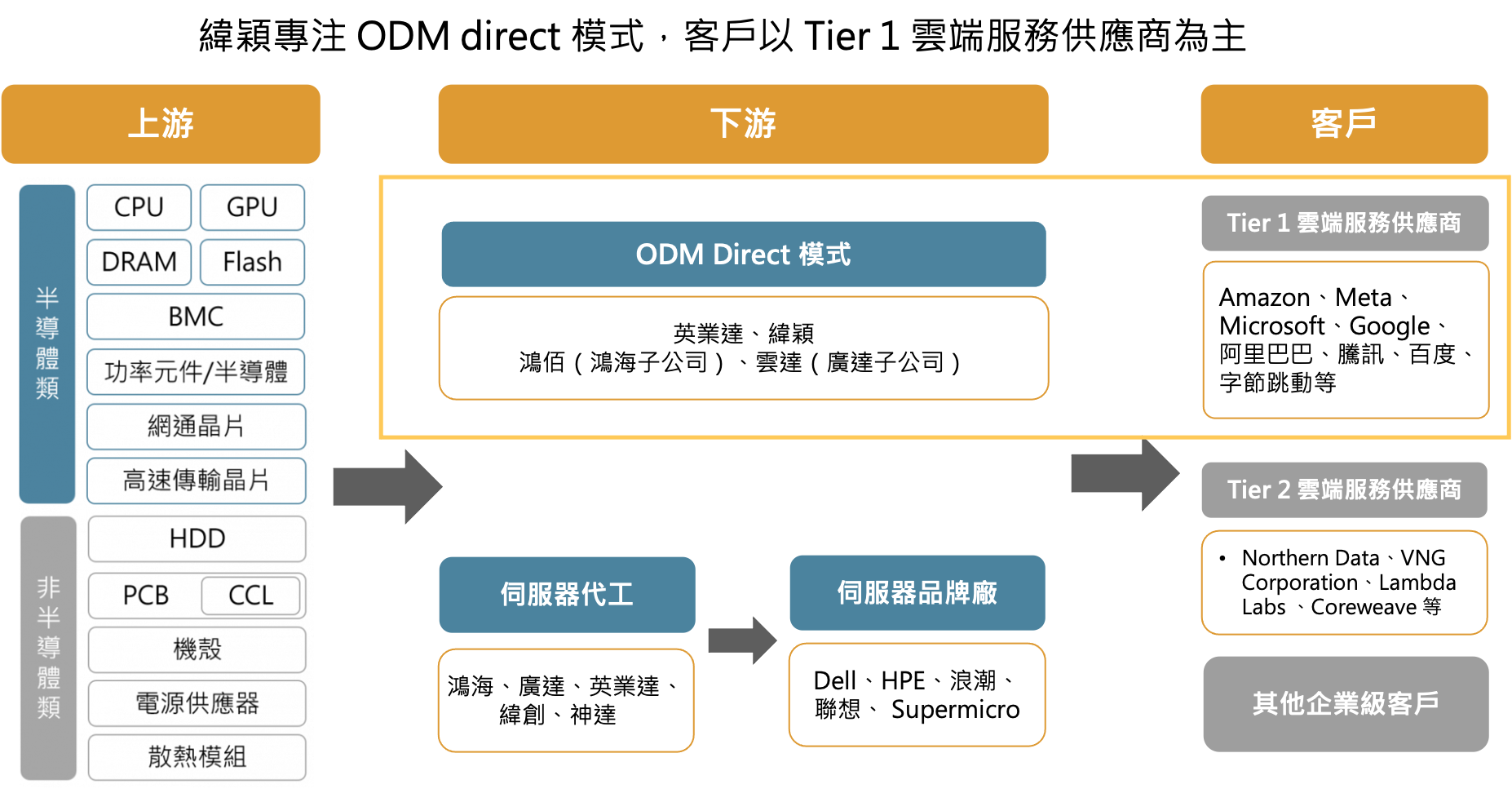 ODM direct 模式是指 ODM 廠跳過品牌廠(如 Dell、HPE)直接供貨給下游雲端服務供應商(CSP),其興起原因主要有二: