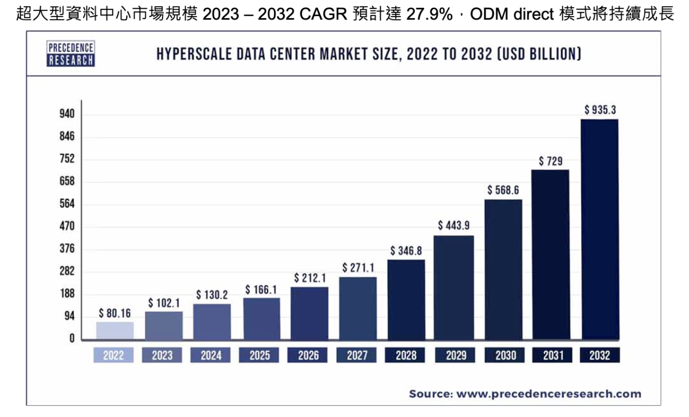以目前來看,因近期 AI 趨勢與企業上雲趨勢明確,雲端服務需求持續增長帶動超大型資料中心大幅擴張,各家 CSP 皆持續加大資料中心相關資本支出,加上雲端產業呈大者恆大的趨勢,富果判斷,超大型資料中心資本支出成長速度將持續超出產業平均,故 ODM direct 模式佔整體出貨量持續上升,而緯穎也會受惠於此趨勢。