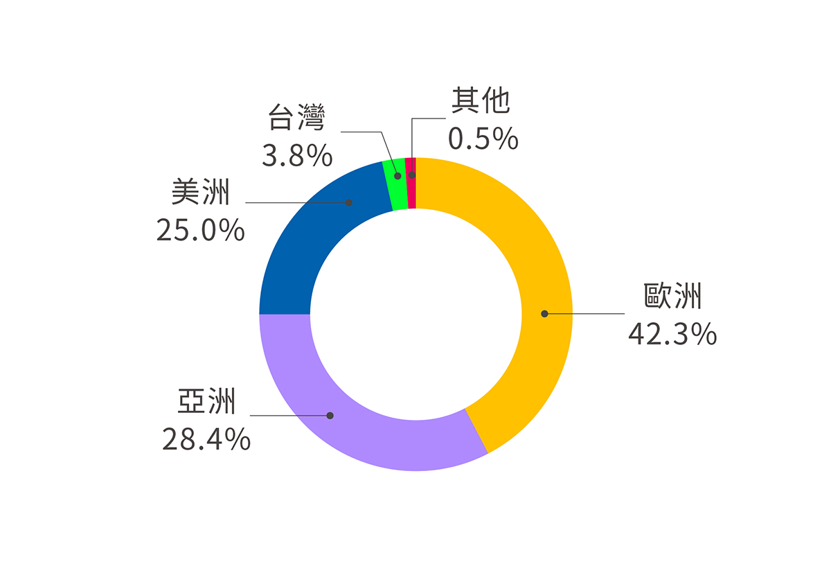 銷售區域市場分佈為:歐洲 42.3%、亞洲 28.4%、美洲 25.0%、台灣 3.8%、其他 0.5%。近期公司透過併購方式,積極擴展海外市場。