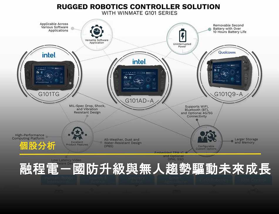 融程電 (市:3416) 成立於 1996 年,為全球前五大的工業用電腦業者,專注於生產複雜環境下運作的強固型電腦與手持式裝置。而醫療、車載、倉儲物流等都是強固型電腦常見的應用場域。此外地面控制站(GCS)產品在國防自主的趨勢下,將成為新成長動能。