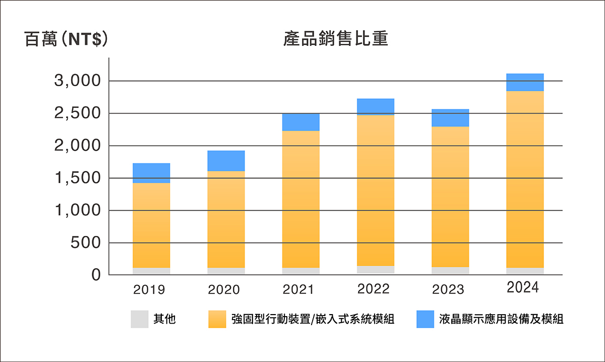 強固型工業用行動電腦營收逐年上升,已成為公司主要收入來源,從先前的 77.78% 上升至 90.91%,其中包含強固型電腦、車載電腦、無人機地面控制器 (GCS) 等;強固型顯示器佔營收 7.76%;其他則佔 1.33%。