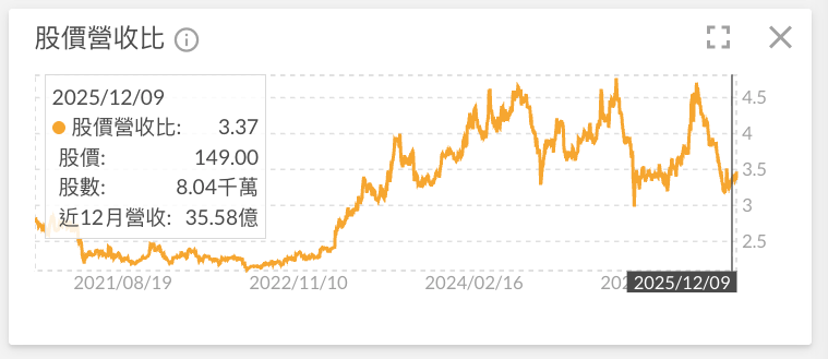 2025 年融程電花費 4.7 億新台幣,併購兩家瑞士當地的 POS 機與工業電腦公司,目前已持有 100% 股權,預計可貢獻母公司每年約新台幣 10 億元的營收,近年來融程電的股股價營收比(見下圖,P/S ratio)大多落在 3 倍以上,此併購案以 0.47 倍(4.7 / 10)取得具有營運實績的子公司,對公司估值應可有正向幫助。此外,公司表示仍會繼續併購其他公司,顯示其擴張的積極性。