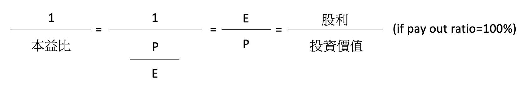 而本益比的倒數正比於每年股利殖利率(在 EPS 全部配發的假設下=pay out ratio 100% )。繼續用上面例子做說明,當台積電本益比是 24.67 倍,即需要 24.67 年才能回本(賺回一倍),每一年的報酬率就是 1/24.67 = 4.05%。