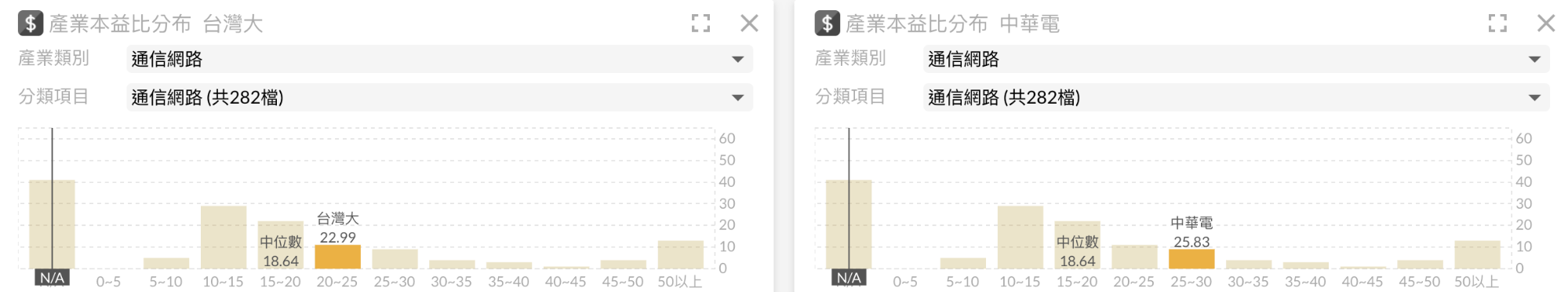 舉例來看,電信業的中華電信及台灣大哥大即享有差不多的本益比,均在 20~25 倍區間中,而市佔率較高的中華電信本益比相對高一些,顯示投資人願意給龍頭公司更高的評價。