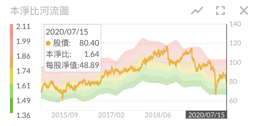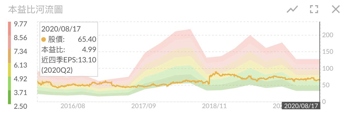 若是希望跟自身過去歷史本益比做比較,可以利用富果本益比河流圖卡片。若目前股價線落在河流圖上端紅色區域,代表本益比位於歷史至今相對高點,相反地,如果股價線是落在河流圖下端綠色區域,代表本益比位於相對低點;此外,根據河流圖整體的流向,也可以知道該公司的本益比區間是在向上移動,持平,還是向下流動,用來判斷是否有 re-rating 的現象,是投資人判斷本益比狀況很重要的參考依據。
