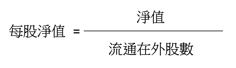 淨值的計算方式為公司的總資產扣除總負債後的價值,也就是會計上的股東權益。雖然字面上,淨值代表的是會計上公司的實際價值,然而清算時不一定真的能以淨值變現所有資產(需要考慮折舊、流動性、以及可買賣性等因素),所以看待一間公司的每股淨值時,需要依據公司的資產品質調整。