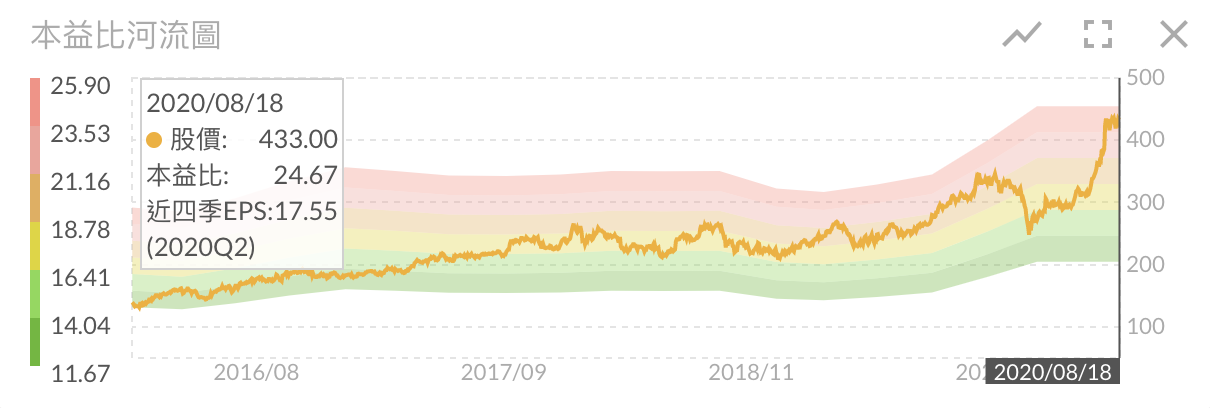 例如台積電目前的股價雖然落在本益比紅色的區間,但整體本益比的河流呈現向上流動的驅勢,未來 23-25 的本益比區間可能會變成黃色的正常區間。