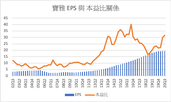 隨著公司成長,獲利能力提升,市場也會給予公司較高的本益比評價。以寶雅(5904)為例,觀察寶雅自 2002 Q3 到目前 EPS 與本益比的關係,可以發現隨著季 EPS 2元成長至近20元,其本益比也從 5~10 倍提升至 25~30 倍的區間,即是因為表現出高成長而獲得了較高的本益比評價,而這種本益比(或其他評價方式)從一個區間移動到另一個區間的過程,我們稱之為 re-rating。