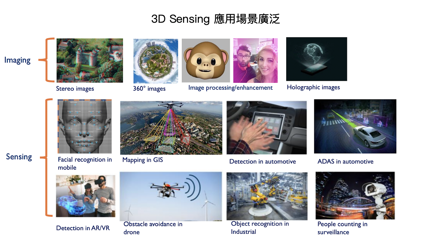 一但能感測出立體的資訊,整個應用的場景就可以大幅增加,小到智慧型手機上的人臉解鎖、3D 相機、智能音箱、自駕車的偵測系統、人臉鑰匙、手勢感應,大到 AI 機器人的感測、工廠控制、醫療、AR/VR 等應用,3D 感測的普及將大幅顛覆我們對世界的想像。