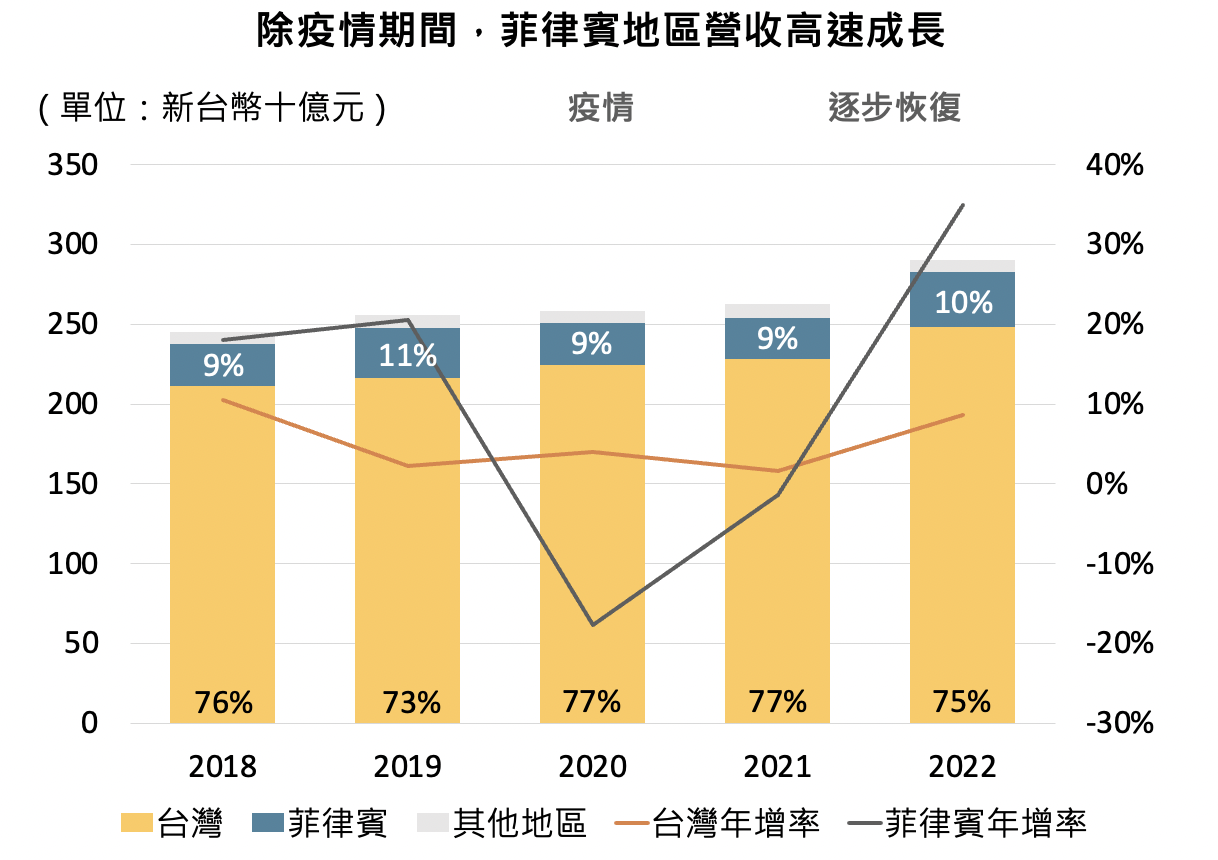 營收地區佔比,台灣 85%、菲律賓 12%、其他地區 3%,觀察過去五年(除疫情期間),菲律賓營收年增率相較台灣地區高,加上臺灣超商本業步入成熟期,因此判斷統一超未來成長潛力來自菲律賓 7-11。