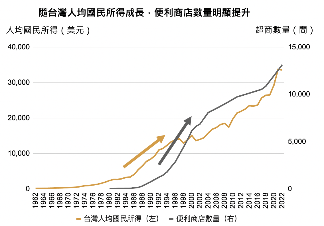 1. 人均國民所得上升,民眾消費開始追求便利性,促進便利商店蓬勃發展