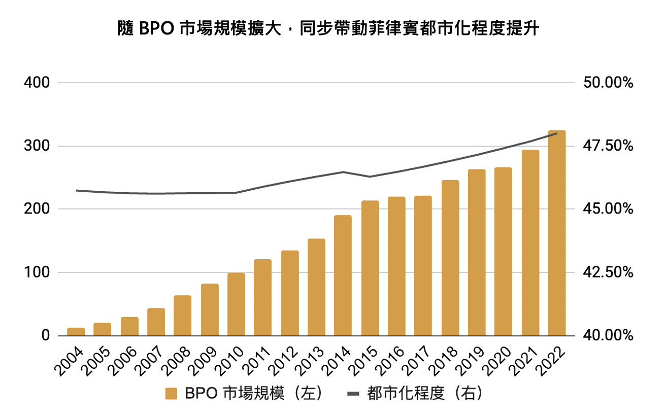近年菲律賓 BPO 行業發展興盛,目前已超越印度,成為全球第一的外包服務地區,2022 年市場規模達 325 億美元,約佔菲律賓 GDP 8%,已是菲律賓未來經濟發展重要推手之一。