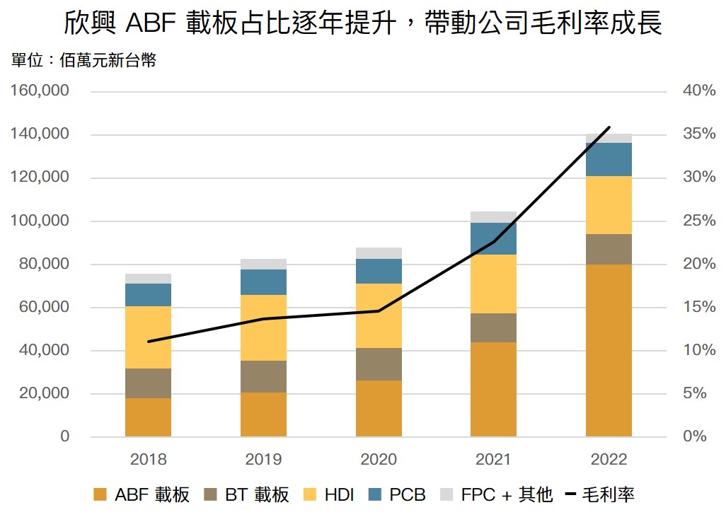 隨著 ABF 載板近年來在高階晶片(如 CPU、GPU 等)封裝上逐漸取代導線架,其需求持續增加(關於 ABF 需求分析,可參考<IC 載板的關鍵材料「ABF」是什麼?ABF 載板需求何時回溫?>),帶動公司 ABF 載板營收占比持續提高,自 2019 年的 25% 成長至 2022 年的 57%,並帶動公司毛利率自 2019 年之 13.7% 成長至 2022 年之 35.9%。