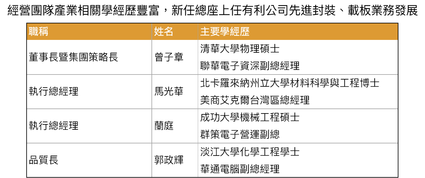 公司經營團隊在 2023 年初出現較大調整,將過往分別擔任技術長和事業處總經理的馬光華先生及蘭庭先生升任執行總經理,兩人分別曾任封測大廠艾克爾(Amkor)臺灣區總經理及群策電子(欣興合併公司,過去以生產 IC 載板為主要業務)營運副總,兩人在封裝、IC 載板領域經驗豐富,判斷此職位調整將為公司持續發展 IC 載板、先進封裝有所助益。