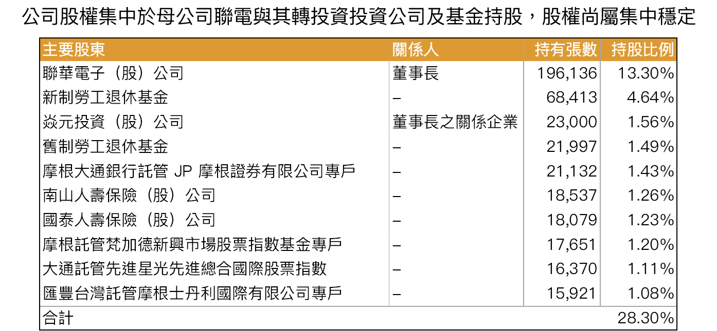 股權部分,母公司聯電與其轉投資之投資公司持有近 15% 股權,該占比自 2016 年起即無明顯變化,其餘則為基金持股。若進一步看集保分布,截至 2023/6/2,持股張數達 1,000 張以上的大股東總計持股比例近期上升至 66.07%(年初不足 60%),整體股權尚屬集中穩定。