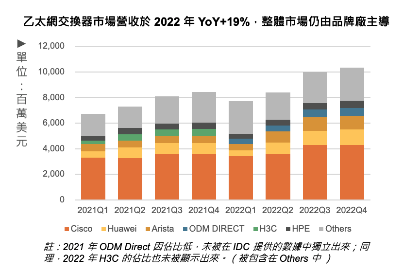 根據 IDC 研調,2022 年全球乙太網交換器營收達約 365 億美元,較 2021 年成長約 19%,整體市場由 Cisco、華為、HPE等品牌廠商領導,白牌交換器市占率在乙太網交換器市場市占率仍為個位數。