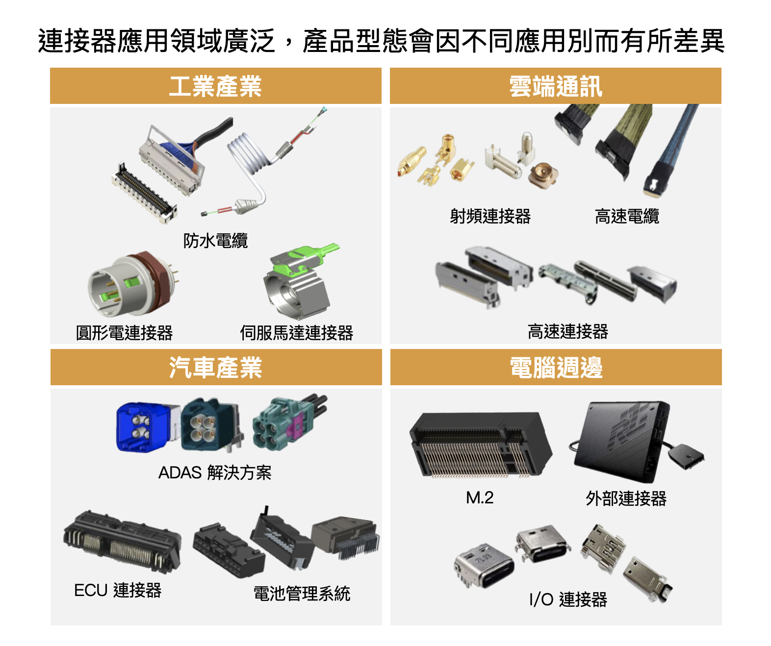 在車用部分,高速連接器主要應用於汽車的駕駛輔助系統、傳感器、GPS 與娛樂系統(包括 FAKRA、HSD 及以太網連接器)。相較之下,低壓連接器應用於汽車的電源管理(BMS)、車燈、空調系統等,這些系統僅需 14V 左右的電壓。電動車為實現更高效的電能傳輸,使用的高壓連接器電壓需達 750-1000V,更加考驗產品的品質穩定度與技術門檻。
