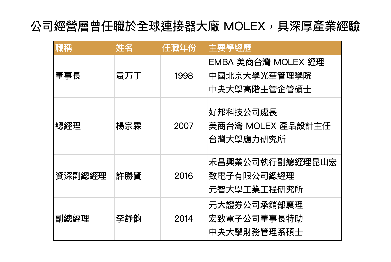 現任董事長袁万丁及總經理楊宗霖,曾任於全球連接器品牌大廠 MOLEX(NASDAQ: MOLX),憑藉過往豐富的產業經驗,帶領公司逐步成為台灣第三大連接器製造商,近年也透過併購來擴充產品線,並帶動公司營收穩步增長。
