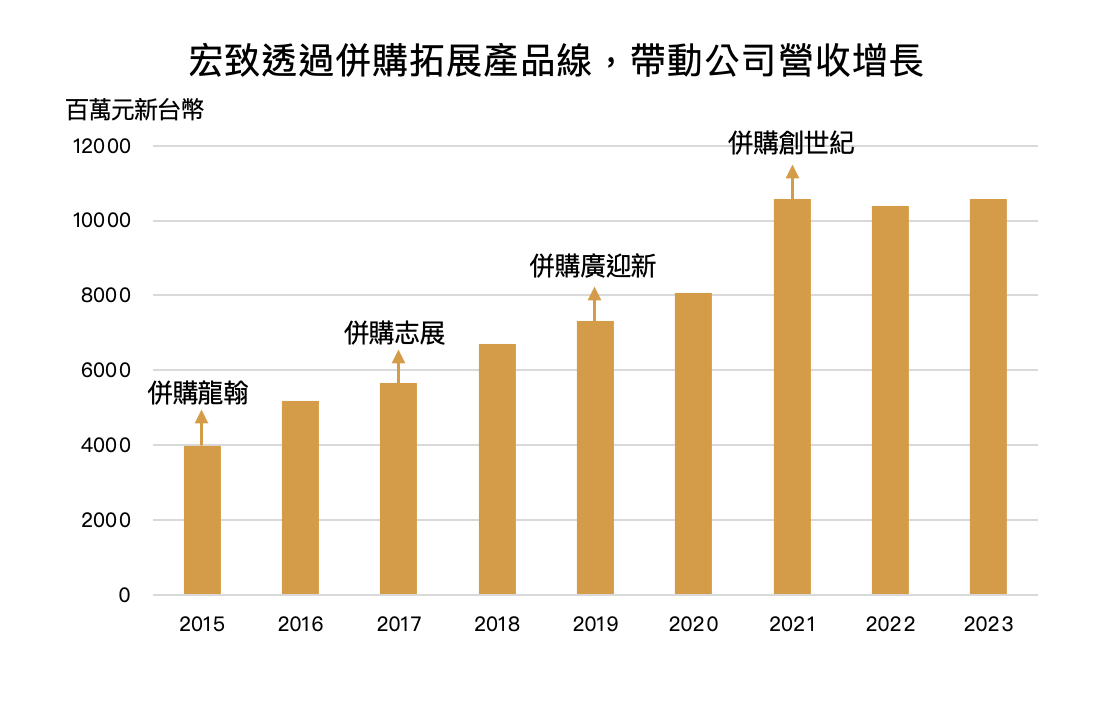 宏致早期由筆電連接器起家,隨筆電市場成熟後,公司便透過併購來切入其他新成長市場,包括車用、伺服器、網通與工控產業。例如 2015 年併購龍翰(MEC),以高速傳輸連接線產品打入白牌伺服器市場;2017 年併購志展,打入歐洲市場;2019 年併購金屬沖壓廠廣迎新來整併產品供應鏈;並於 2021 年併購美國創世紀,成功切入高速連接器與網通市場。