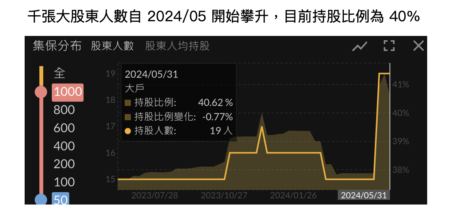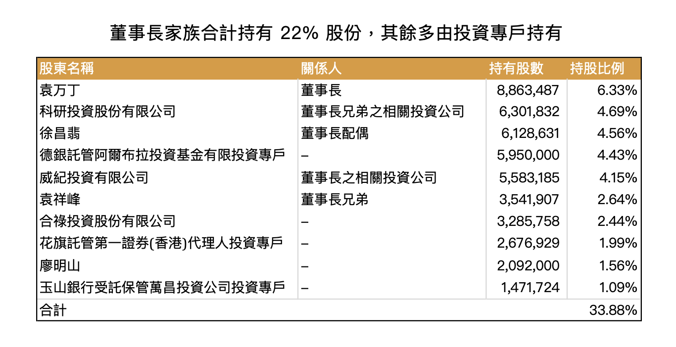 股權方面,董事長家族合計持有 22% 股份,其餘則多由投資專戶持有,整體股權穩定。