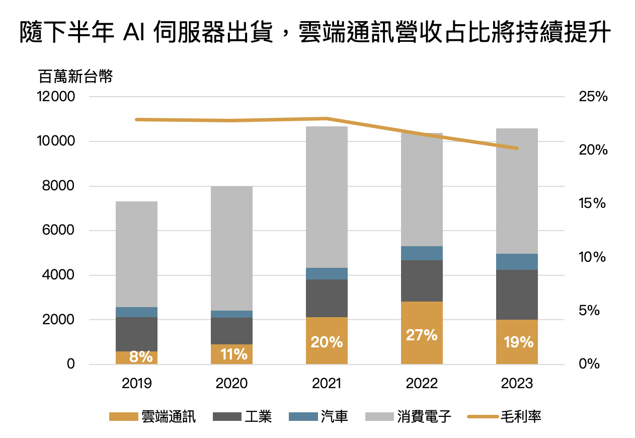 公司 2023 年營收占比為消費電子 53%、工業 21%、雲端通訊 19%、汽車 7%,近年雲端通訊佔比持續提高,2023 年佔比下降主因美國客戶進行庫存調整,隨 2024 年庫存去化完畢、下半年 AI 伺服器出貨,預期雲端通訊佔比將持續提升並帶動公司營收增長。