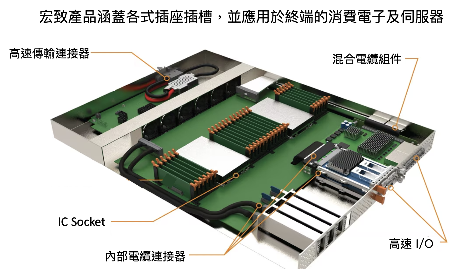 宏致的生產機台由公司自行設計和製造,從投料、檢驗到包裝均由公司一條龍完成,提升了產品開發和生產的靈活性。公司產品涵蓋各式終端應用,產品包括 IC Socket、USB3.0、PCIe、SATA、M.2 等插槽和插座,產品佈局完整。