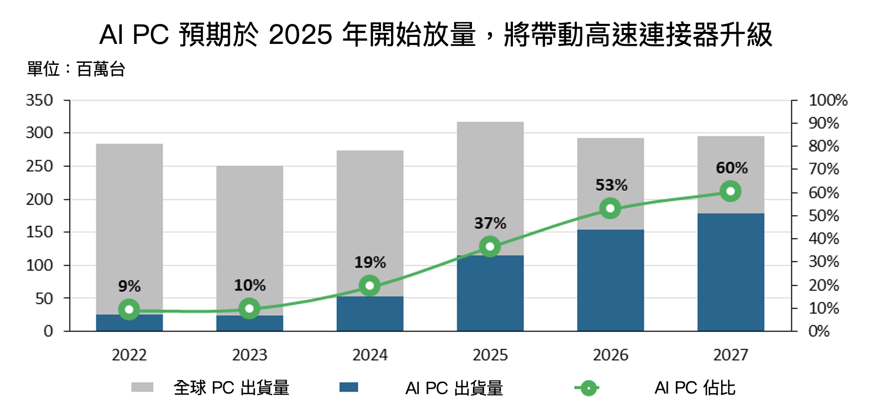 據 Canalys 研調, AI PC 預期於 2025 年開始放量,並於 2027 年達到 PC 市場 60% 的佔比。隨 AI PC 需更高的數據傳輸率與更低延遲,對於高速連接器的需求也將隨之提升,較高的技術門檻與品質也將帶動其 ASP 增長。預期隨 2024 下半年各家品牌廠之 AI PC 的推出,將帶動 PC 市場迎來一波換機潮,預期 2024 年全球整體 PC 出貨量較 2023 年 YoY+2%。