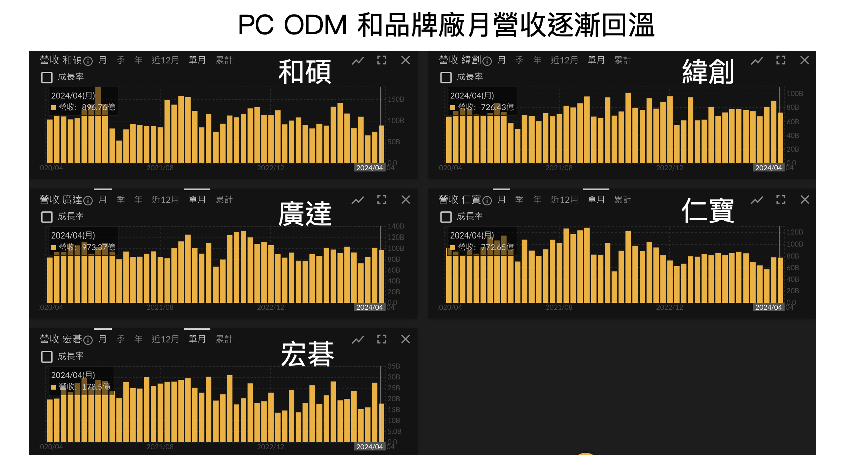 觀察目前 PC 品牌廠、ODM 廠的庫存水位逐漸回復至過往水平,月營收亦開始逐月回溫,整體供給狀況已趨於好轉。