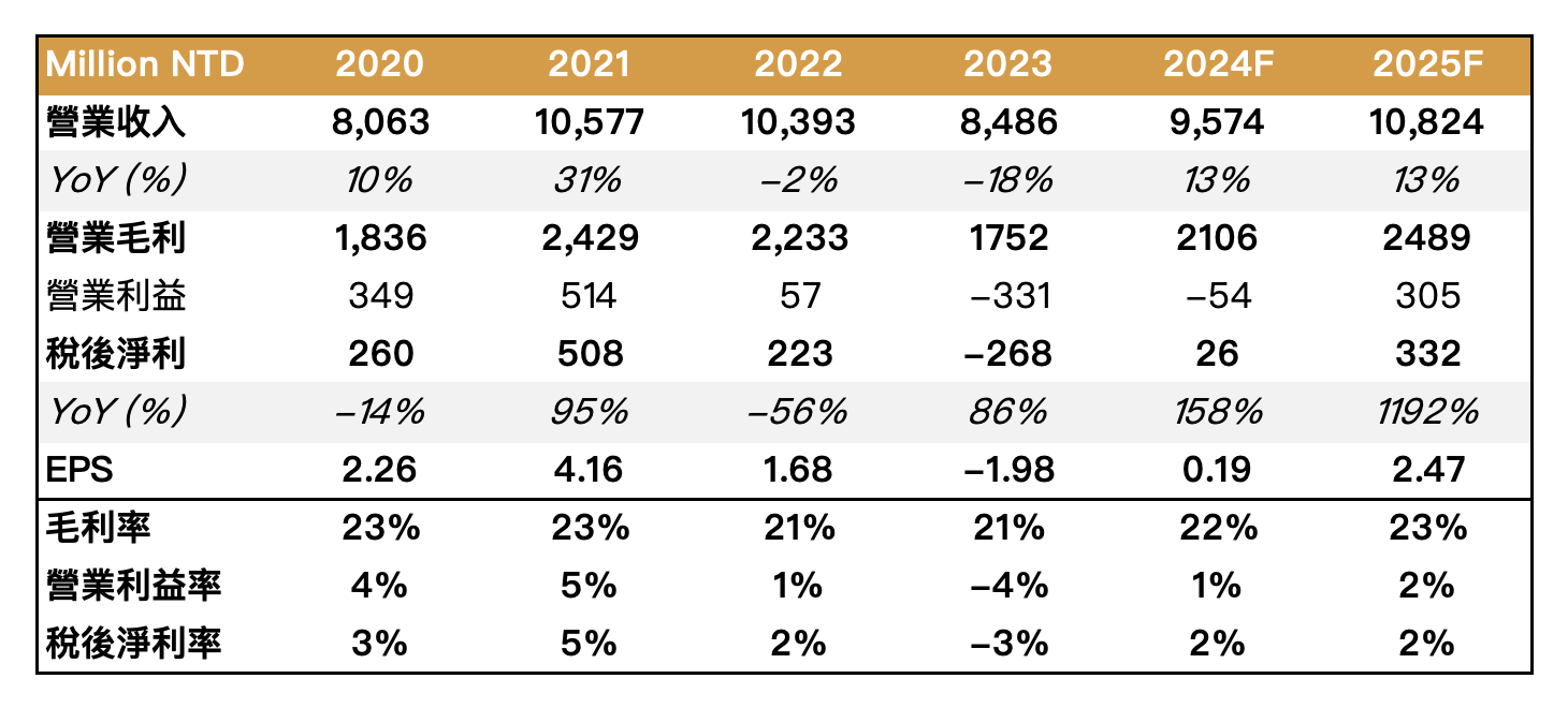 毛利率部分,受惠 AI 相關產品營收占比提升,2024 年預估為 22%,YoY+1.0ppts;2025 年進一步推升至 23%,YoY+1.0ppts。EPS 部分,預估 2024 年 EPS 為 0.19 元,YoY+2.17 元;2025 年可達 2.47 元,YoY+2.28 元。